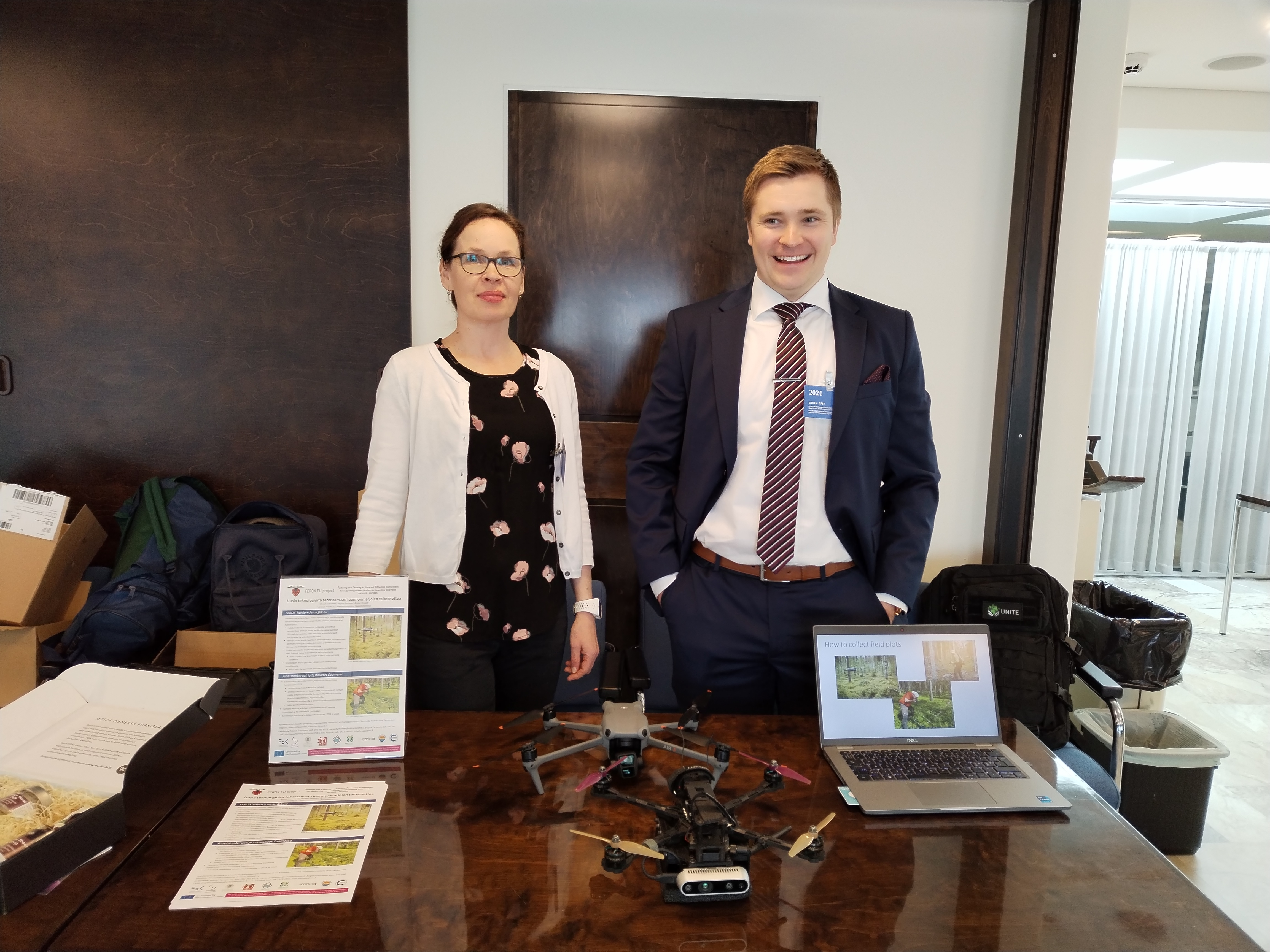 Luonnontuotealan info- ja keskustelutilaisuus kansanedustajille ja muille eduskunnassa työskenteleville henkilöille järjestettiin Helsingissä 22.5.2024. Marjut Turtiainen ja Birgitta Partanen (Arktiset Aromit ry) ja Väinö Karjalainen (Maanmittauslaitos) esittelivät tilaisuudessa myös FEROX-hanketta (ks. esite). Kiinnostusta herättivät erityisesti dronet, joita Väinö oli tuonut paikalle.
