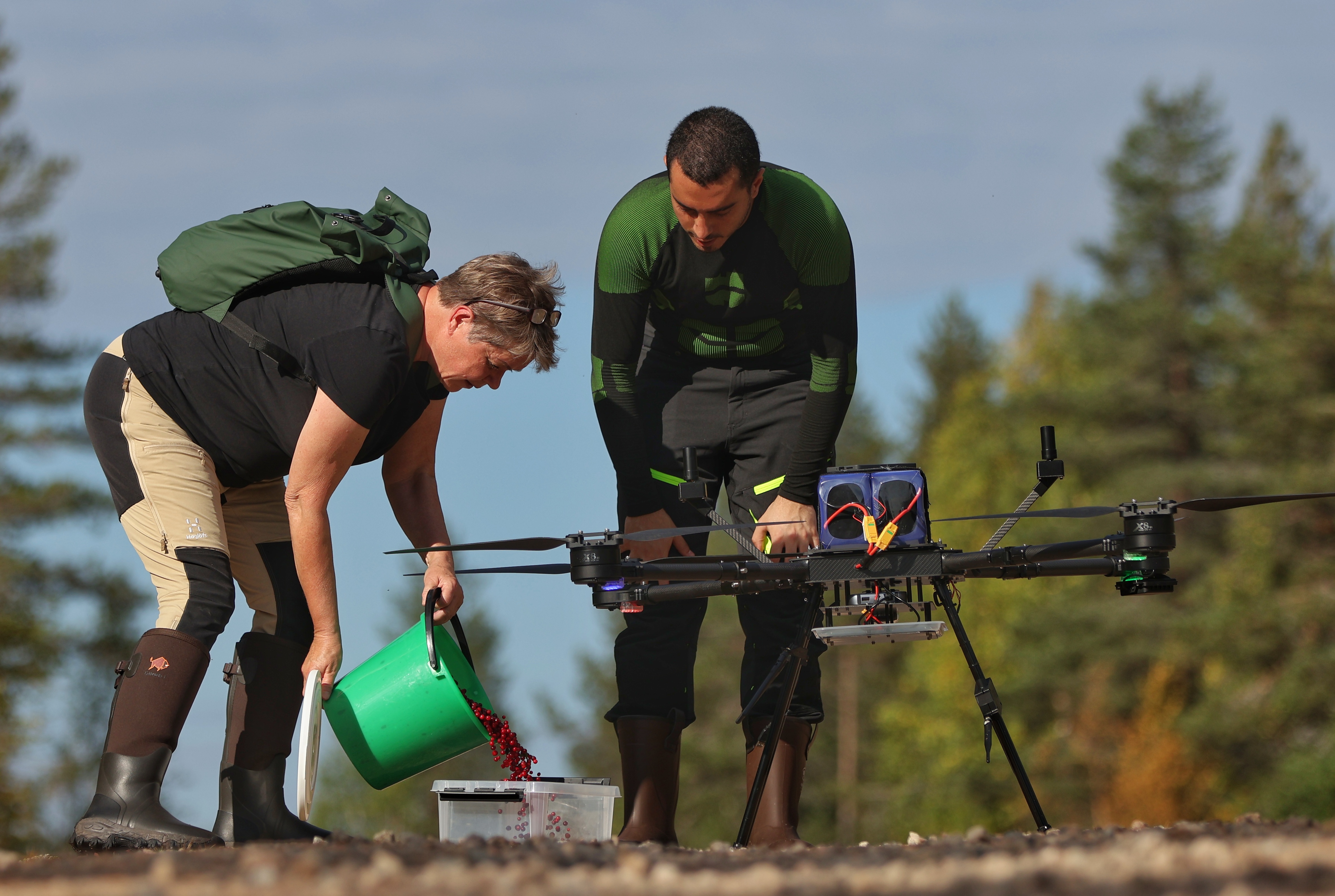 Hankkeessa kehiteltyä teknologiaa testattiin Rovaniemellä syyskuun ensimmäisellä viikolla v. 2024. Testaajina toimivat paikalliset poimijat, mutta myös hankehenkilöstö pääsi osallistumaan joihinkin testeihin. Puolukkasato ei ollut järin runsas, mutta muutoin olosuhteet olivat mitä parhaimmat. (Kuvat: Paul Chippendale / FBK)