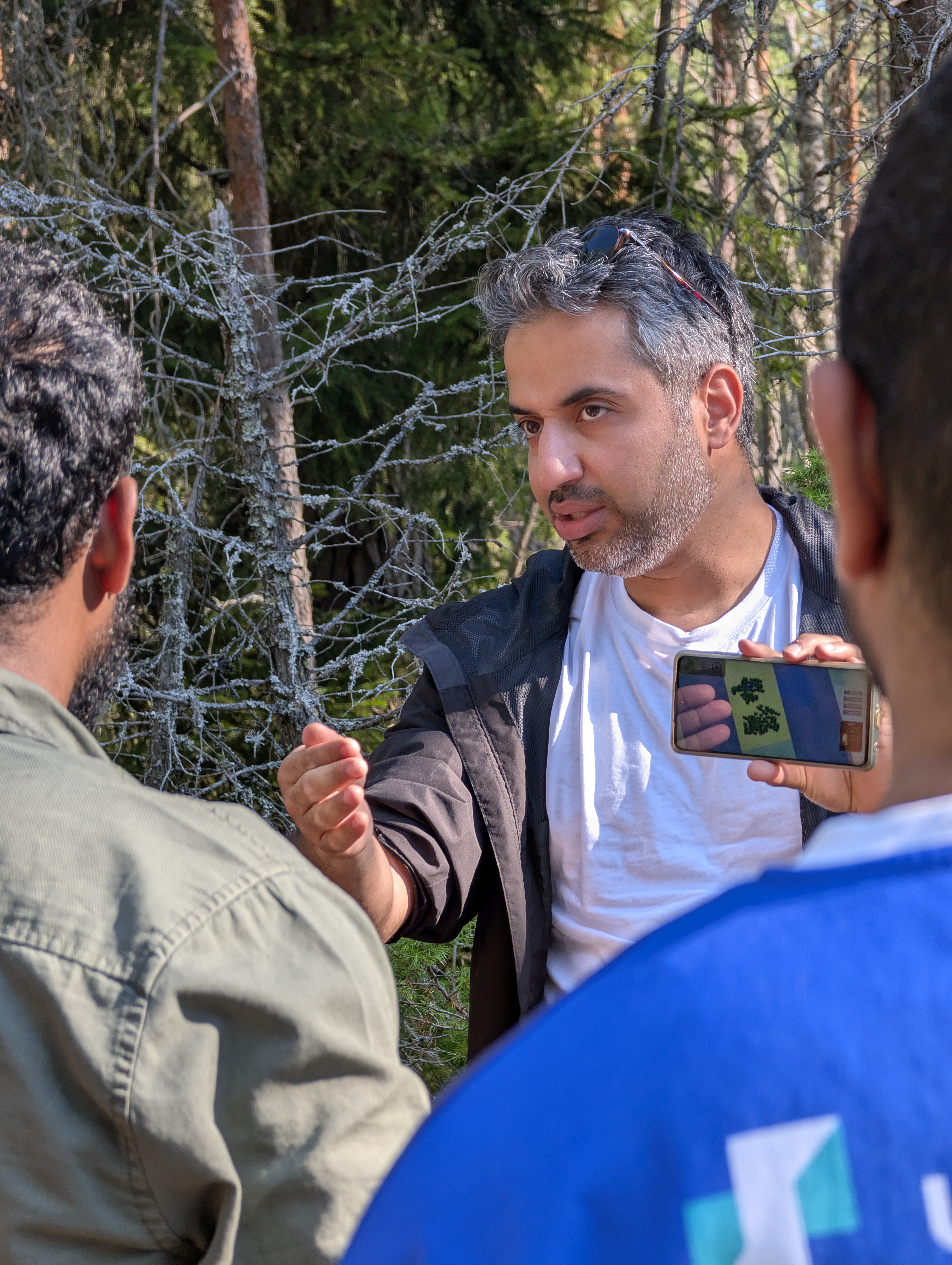Hankkeessa kehiteltyjä teknisiä sovelluksia ja ratkaisuja testattiin Espoon Nuuksiossa heinäkuussa 2025. Testien suorittamiseen osallistui yhteensä noin 30 marjastajaa, joista osa oli suomalaisia ja osa ulkomaalaistaustaisia. Kuvassa hankkeen tutkija Seyedamir Ahmadi (Tampereen yliopisto) perehdyttää poimijoita uuteen marjakarttasovellukseen. (Kuva: Paul Chippendale / FBK)