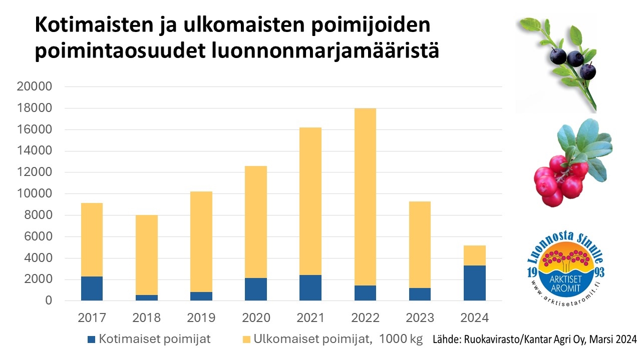 Ennen vuotta 2024 thaimaalaiset kausipoimijat olivat keränneet noin 80-90 prosenttia Suomessa kaupallisesti poimituista luonnonmarjoista. Vuonna 2024 thaimaalaiset poimijat olivat ensimmäistä kertaa työsuhteessa marja-alan yritysten kanssa. Ulkoministeriön päätös edellyttää maahan saapuvalta poimijalta viisumin sijaan työntekijän oleskelulupaa tuli vasta maaliskuussa, ja valmistautumisaika uuteen toimintatapaan jäi lyhyeksi.Lopulta Suomeen saapui Thaimaasta vain noin 800 poimijaa. Hekin pääsivät paikalle vasta, kun satokausi oli pitkällä. Lakkakausi ehti mennä ohi, ja myös mustikan keruuaika jäi lyhyeksi.